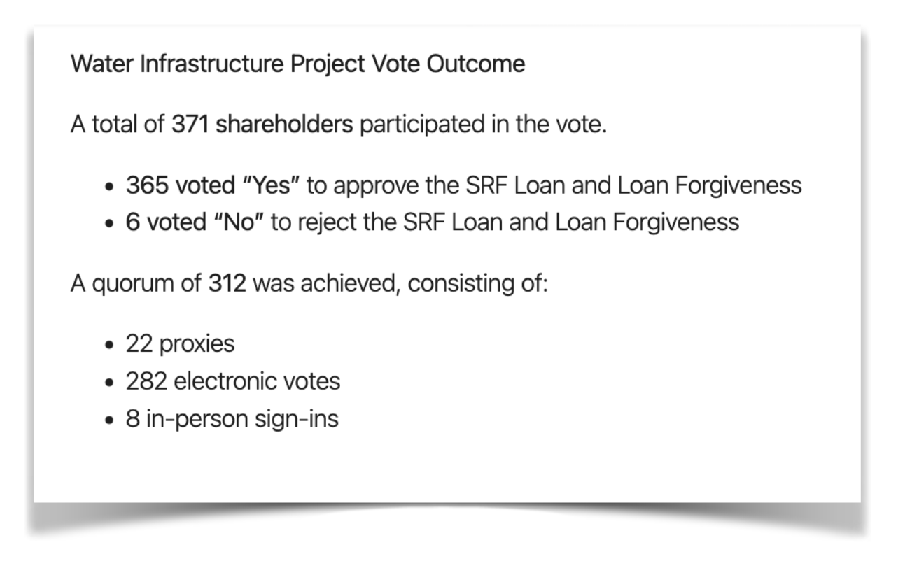 Shareholders - Go to the Shareholders Info tab, News for You section, to see our Manager’s Updates. If you need the password, please call the office. BOARD MEETING MINUTES available on the Shareholder Info/Board of Director’s Tab